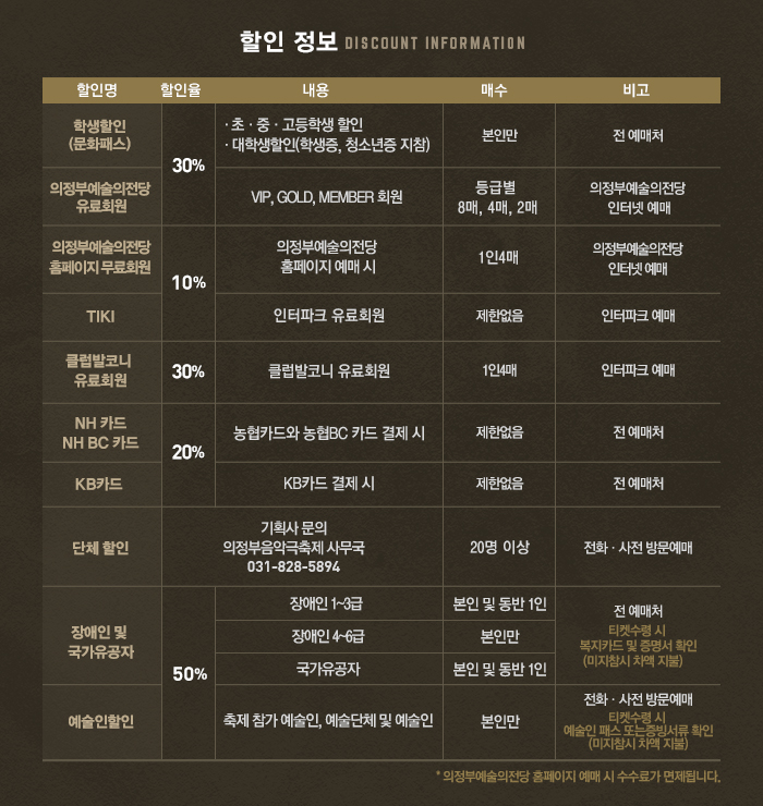 *±¹°¡À¯°øÀÚ(2¸Å)50%, Àå¾ÖÇÒÀÎ: (Àå¾Ö1~3±Þ/º»ÀÎÆ÷ÇÔ 2ÀÎ 50%, 4~6±Þ/º»Àθ¸ 50%), * ±¹°¡À¯°øÀÚ,º¹ÁöÄ«µåÇÒÀÎ ¶§´Â °ø¿¬´çÀÏ ÇØ´ç½ÅºÐÁõ ÁöÂü(¹ÌÁöÂü½Ã Â÷¾×ÁöºÒ)
